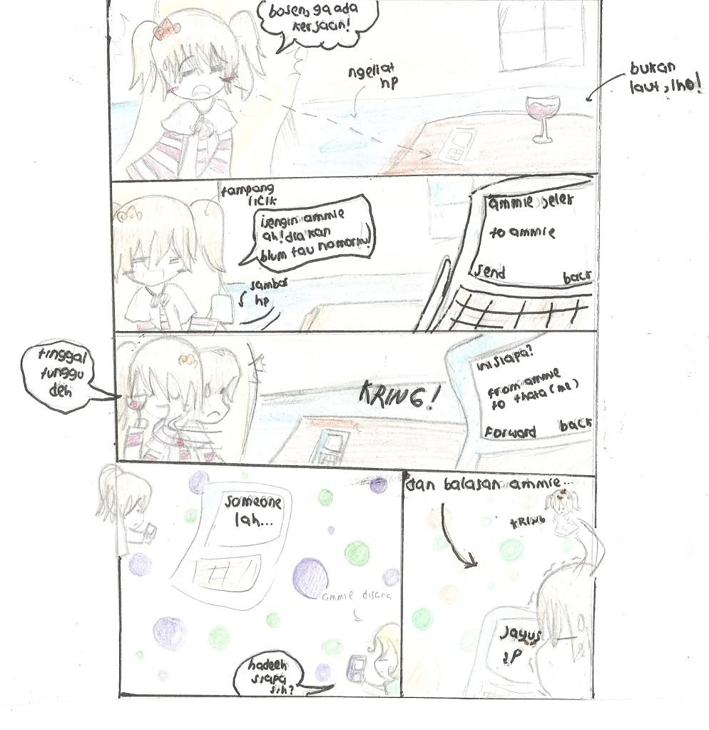panel 2: Tiba-tiba, ia berpikir untuk ngerjain Ammie, sahabatnya. Tuh, tampangnya aja udah licik! Dia nyambar handphonenya sambil berkata, "isengin Ammie ah, dia kan blum tau nomorku!" nah, si Thatha itu kirim sms buat Ammie, isinya; 'ammie jelek'
